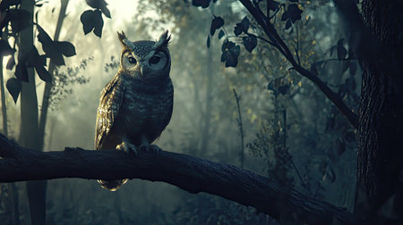 Immerse yourself in the ethereal beauty of night A great horned owl rests peacefully on a branch, bathed in soft, foggy moonlight The scene is both eerie and captivating, enhanced by vibrant foliage This atmospheric wildlife image showcases a serene moment in nature with a deep, wonderful composition AI Generative