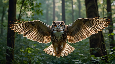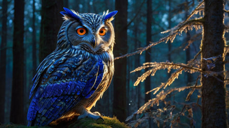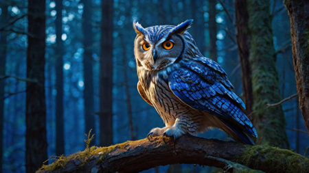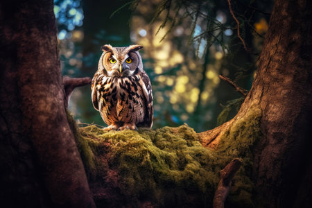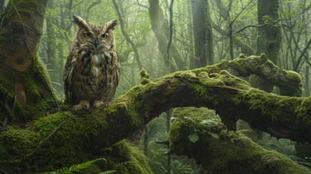 A majestic owl perched on a moss-covered branch, surveying its domain in the forest.