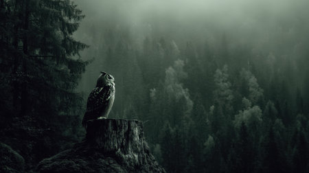 A stunning image capturing a solitary owl sitting on a tree stump amidst a misty forest. The dark green hues create a tranquil atmosphere, evoking a sense of mystery and serenity in nature.