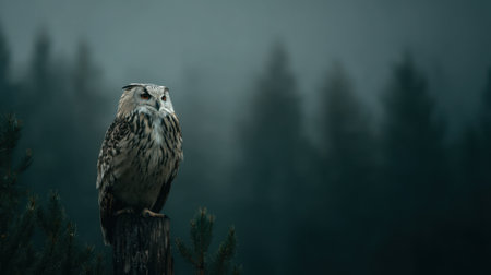 A stunning portrait of a majestic owl perched on a wooden stump, set against a foggy backdrop of dark green trees, evoking a sense of mystery.