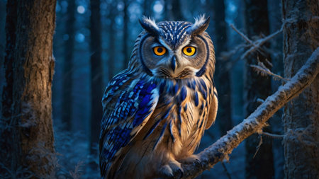A majestic owl perched on a gnarled branch, surveying the untamed wilderness with fierce and piercing eyes