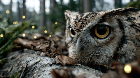 A mesmerizing close-up of an owl resting on a forest floor, surrounded by fallen leaves and soft glowing lights in the background, showcasing nature's tranquility.