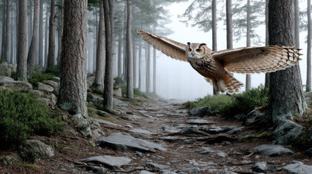 A stunning owl gracefully soars through a misty forest, showcasing the beauty of wildlife amid rocky pathways and towering trees at dawn.