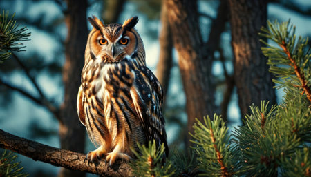 An owl is showcased perched on a branch, set against the backdrop of a blurred forest. The image presents warm and cool tones, highlighting the owl's detailed plumage. This shot's composition, with soft lighting and focus, lends itself to various editorial and commercial applications.
