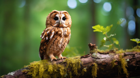 An enchanting owl sits gracefully on a moss-covered log, surrounded by lush green foliage and soft, diffused light in the forest.