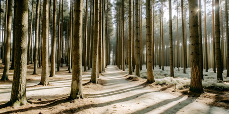 Serene forest scene featuring tall, straight pine trees with sunlight filtering through branches, creating warm and inviting atmosphere. vibrant colors of nature evoke sense of peace