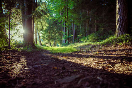 Path in the forest with tall trees and sunlight. Beautiful landscape.