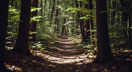 Explore the serene beauty of a dense forest where sunlight gently filters through lush green leaves, creating a tranquil and peaceful environment, perfect for nature lovers.