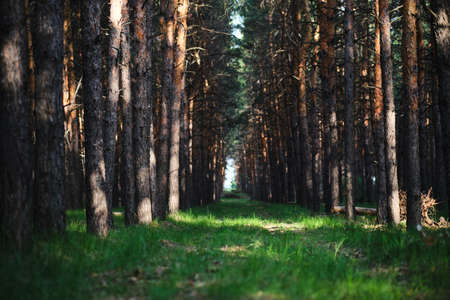 Green grass in a pine forest between rows trees warm, sunny, summer day