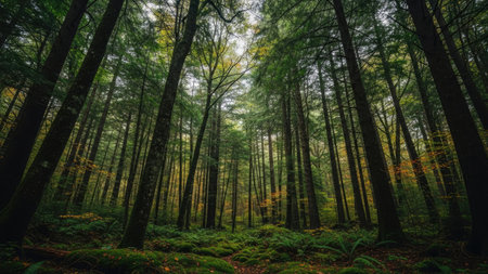 A tranquil forest scene featuring tall trees surrounded by lush greenery and soft moss. This natural environment evokes a sense of peace and serenity.