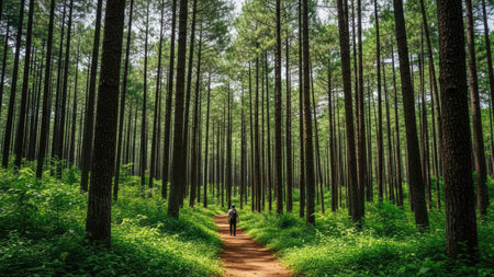 Discover a serene pathway winding through a majestic pine forest, characterized by tall trees and a natural green undergrowth. The tranquil scene invites exploration and reflects the beauty of untouched nature.