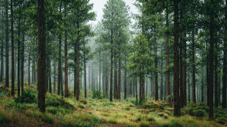 This captivating image showcases a misty forest where tall evergreen trees rise through a gentle fog, creating a serene and tranquil atmosphere perfect for nature lovers.