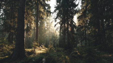 A beautiful forest scene illuminated by soft sunlight at dawn, featuring tall trees and lush underbrush, perfect for nature lovers and outdoor enthusiasts capturing tranquility.