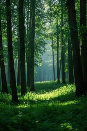 Sunlight filters through the tall trees of a vibrant green forest casting gentle shadows on the lush grass below. This peaceful setting invites exploration and tranquility.