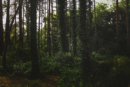 Dark and moody pine trees scenery.