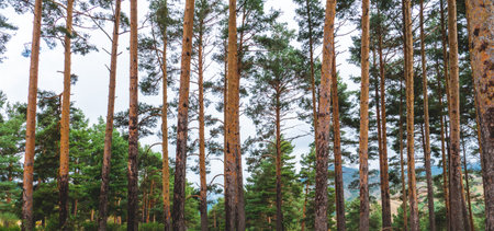 Pine tree forest in the morning. Panoramic view.