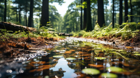 A peaceful view of a forest with sunlight filtering through the trees, creating beautiful reflections on a shallow water surface in a serene woodland setting.