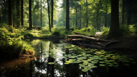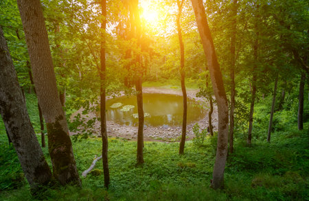 beautiful green forest and pond in the morning, nature series.