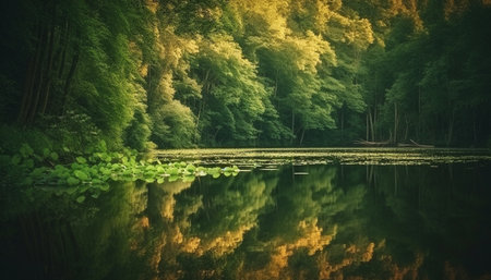Tranquil scene of a forest pond reflects the beauty of nature generated by artificial intelligence