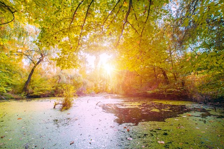 Beautiful autumn swamp scenery Protected wetlands bathed in golden light.