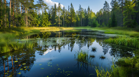Small lake in the forest during summer. Sky reflections in water. Beautiful natural landscape