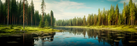 Picturesque scenery of the lake in a pine forest with a symmetry reflections in a crystal clear water. Natural mirror. Pure nature, environmental conservation, ecology. Panoramic view, copy space