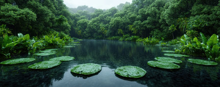 A serene scene featuring lily pads on calm water, surrounded by lush green foliage and enveloped in morning mist, creating a peaceful ambiance in nature.