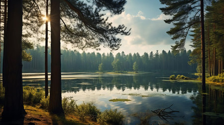 the serene countryside landscape unfolds between towering pine trees, offering a glimpse of a tranquil lake's calm waters, surrounded by lush greenery and majestic tree trunks, evoking a sense of peacefulness and connection with nature's beauty. ai generated