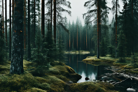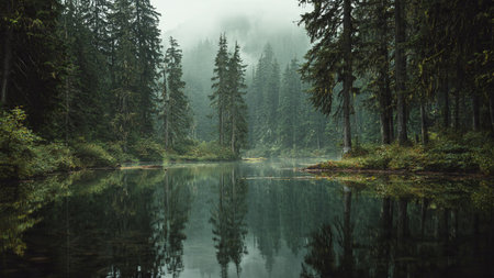 Discover the tranquil beauty of a serene forest lake, surrounded by towering evergreen trees and enveloped in mysterious fog. This peaceful scene invites reflection and relaxation in a captivating natural environment rich in greenery and calm waters.