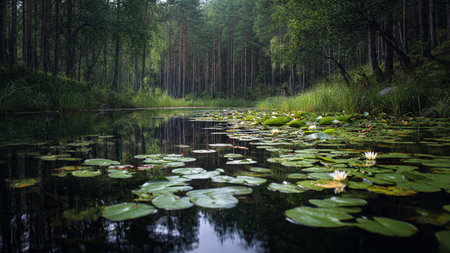 Beautiful lake in the forest with green water lily pads and trees.