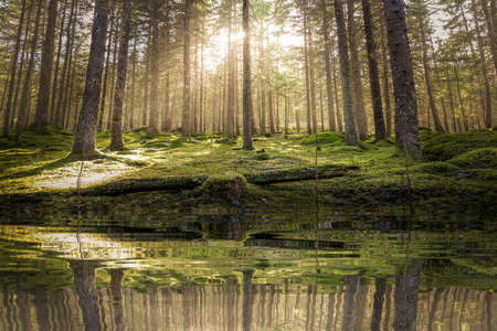 Pond / lake in mossy green forest. Golden sunlight before sunset with sun rays pouring through the trees, create mystic, cozy atmosphere.