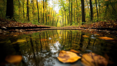 Colorful autumn foliage reflecting on a tranquil river in a serene forest