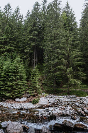 Mountain river in the coniferous forest. The concept of active and photo tourism