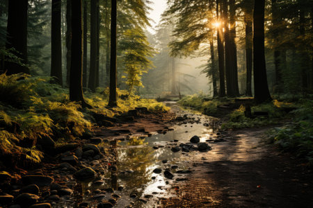 This captivating image captures a tranquil forest scene with tall trees and lush greenery, where gentle sunlight filters through thick foliage, creating a peaceful atmosphere.