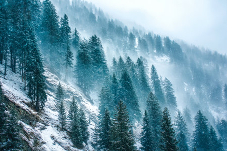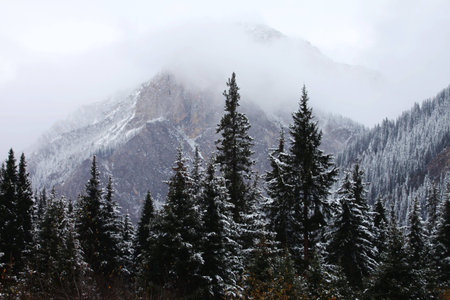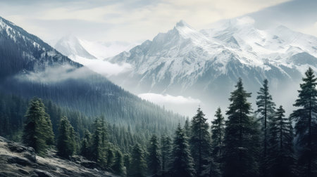 Winter landscape showcases snow-laden evergreen trees and majestic rocky mountains, shrouded in mist, evoking a peaceful and serene ambiance in nature