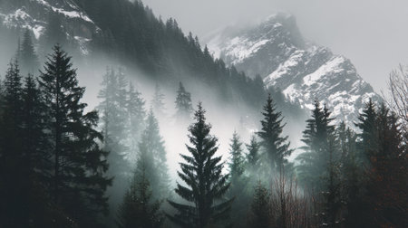 This captivating image showcases a mystical forest with towering pine trees beneath majestic mountains. Fog blankets the landscape, creating an enchanting atmosphere.
