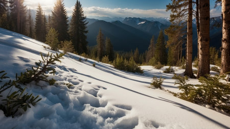 Snowy Mountain Winter Landscape Scene Beautiful Nature Cold Season Forest Trees icy pine view calm