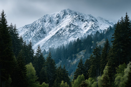Towering snow-covered peaks loom over a dense forest of evergreen trees, creating a breathtaking view of nature's majesty and tranquility during early morning hours.