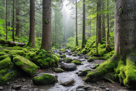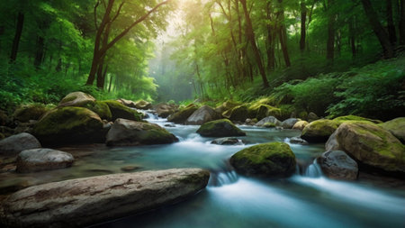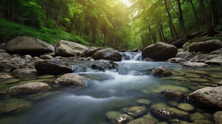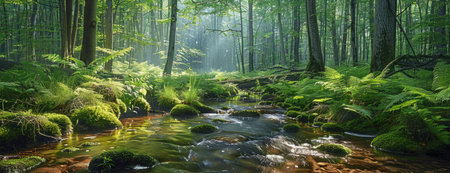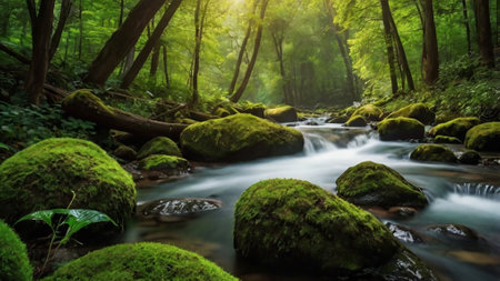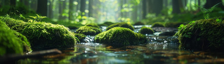 A stream flows through a dense forest with mossy rocks and vibrant green foliage. Sunlight filters through the trees, illuminating the water and creating a sense of depth. The image displays natural textures and colors, suitable for environmental or nature-related projects.