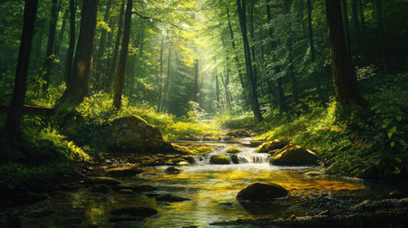 Tranquil forest with a stream and dappled sunlight filtering through