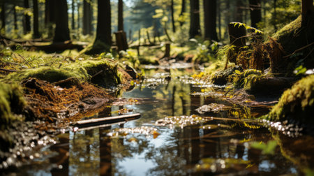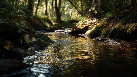 A stream gently meanders through a dense forest, reflecting dappled sunlight. The scene features various shades of green, with water textures creating visual interest. The composition presents a low-angle perspective, emphasizing depth and natural beauty. This image is suitable for environmental, nature, or wellness-related content.
