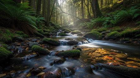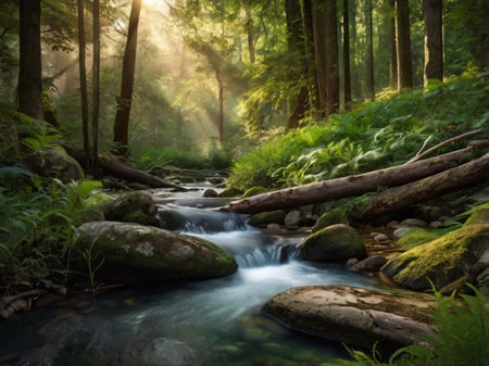A beautiful and tranquil forest scene featuring a flowing stream illuminated by sunlight, surrounded by lush greenery and moss-covered rocks.