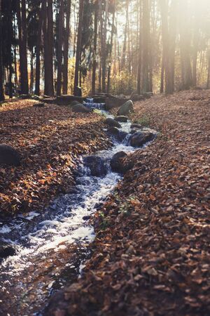 forest water stream at sunset. autumn park