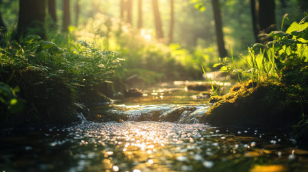 Experience tranquil nature scene with a sun-drenched stream gently cascading through a vibrant green forest.