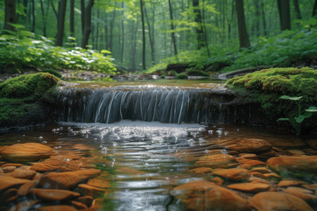 A tranquil forest scene featuring a gentle stream flowing over moss-covered rocks, surrounded by vibrant greenery and tall trees.