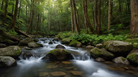 A serene view of a crystal clear stream winding through a vibrant green forest, surrounded by moss-covered rocks and tall trees, creating a peaceful natural environment.