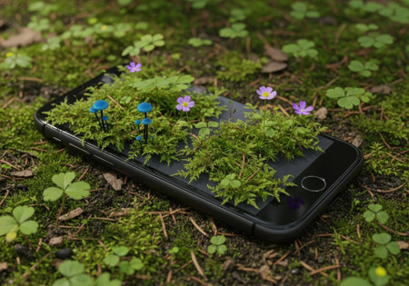 A black smartphone lies on a mossy forest floor, with moss, blue mushrooms, and purple flowers growing out of it, blending technology and nature in a surreal composition.