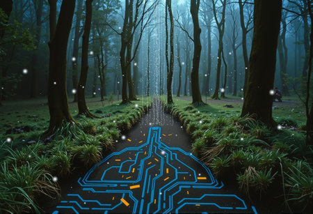A serene forest setting is captured with tall trees extending towards the sky, their leaves creating a natural ceiling. The forest is shrouded in a mist, adding to the mysterious and tranquil atmosphere. On the forest floor, a glowing blue circuit pattern like a digital pathway emerges, reflecting the juxtaposition of nature and technology. Tiny lights are scattered throughout the scene, resembling fireflies suspended in the air, enhancing the ethereal nature of the environment. The pathway seems to draw the eye forward to a vanishing point, inviting exploration and contemplation. The combination of natural and digital elements suggests a harmonious coexistence between technology and the environment.