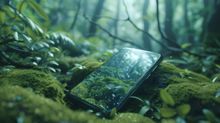 Eco-friendly smartphone covered in moss amidst lush greenery, symbolizing green technology integration.