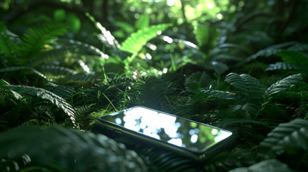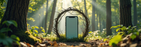A smartphone is seamlessly integrated into a lush forest, symbolizing the harmonious meeting of technology and nature